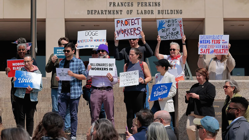 Demonstrators rally in protest of workforce cuts to the U.S. Department of Labor during a press conference outside the agency’s headquarters on April 14, 2025, in Washington, D.C. After a layoff, ratings from current employees take more than two years to recover, Glassdoor data indicated.